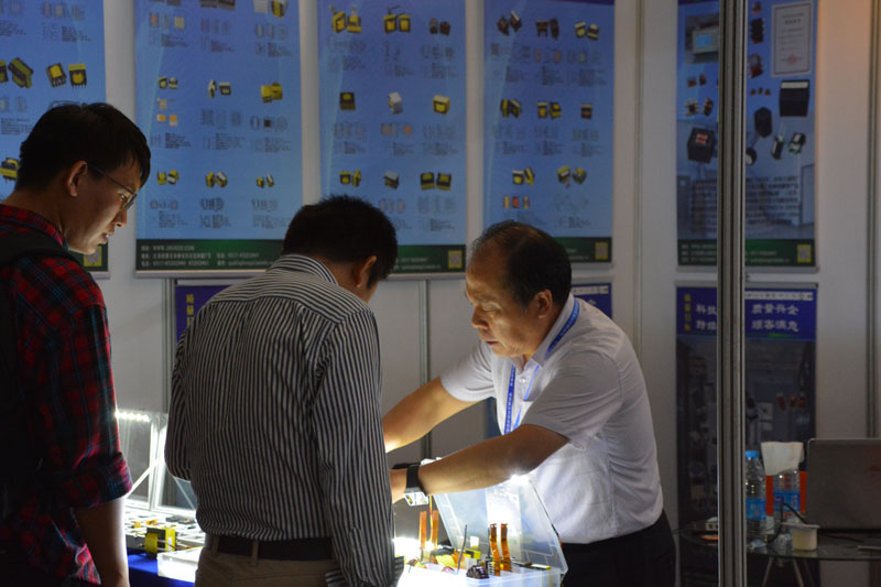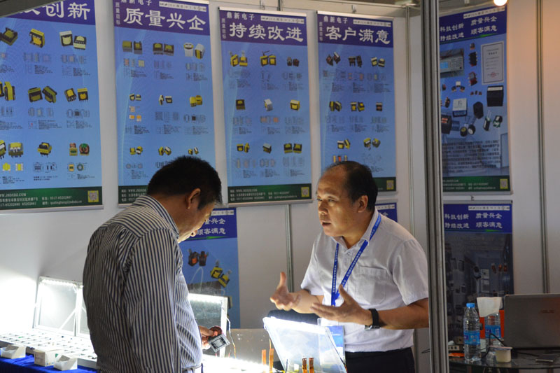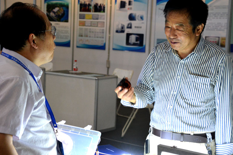 公司總經(jīng)理在展臺前與參觀(guān)者在交流產(chǎn)品